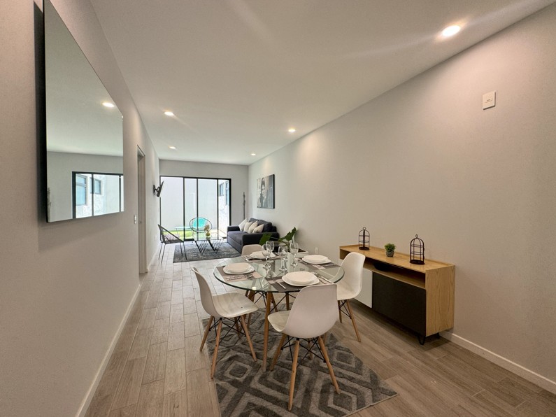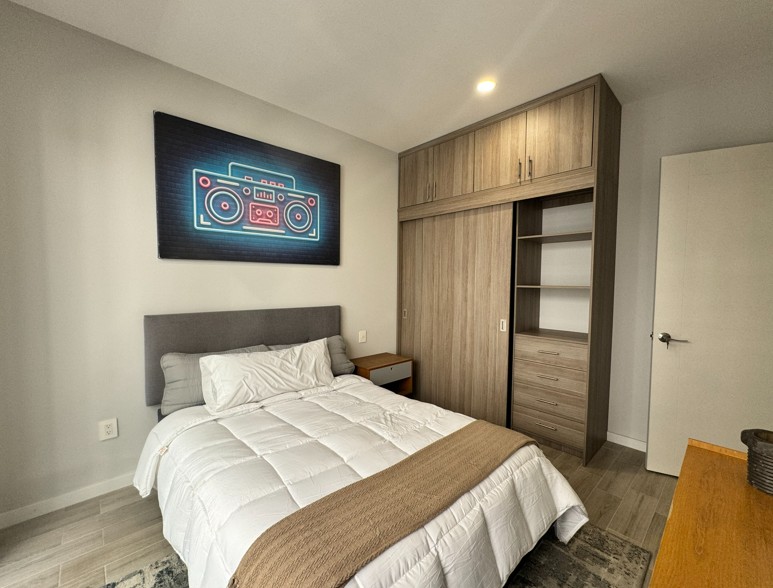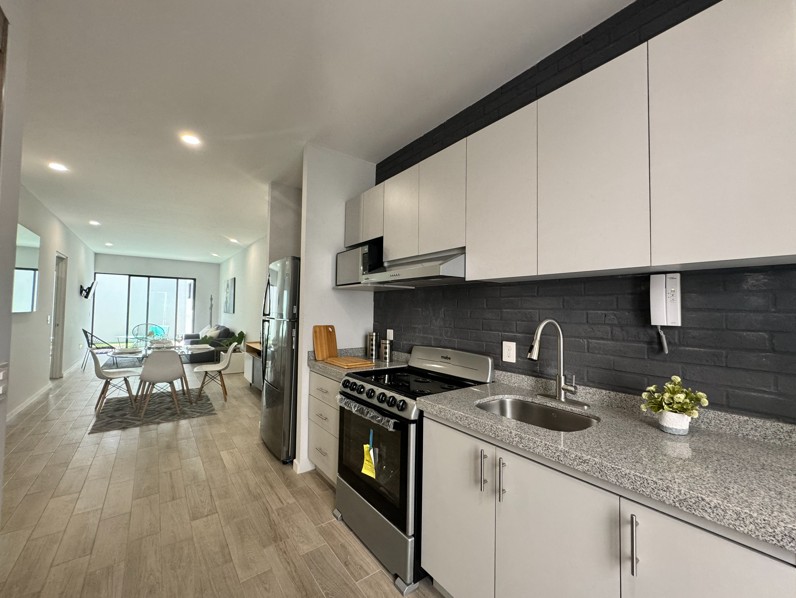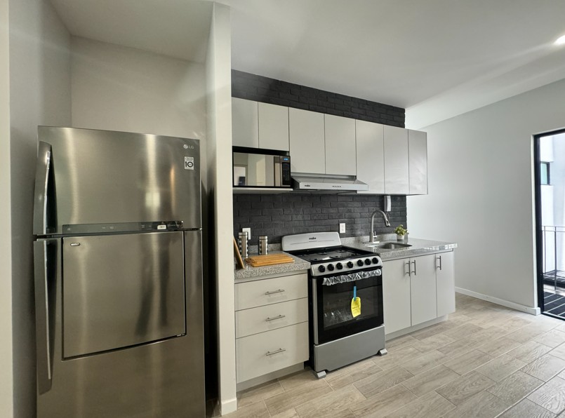 Pisos de porcelanato en todas las áreas con diferente color y textura, carpintería, closets y cocina con barra de granito. 2 recámaras, 2 baños completos, cocina, sala, comedor, terraza, opción a roof garden, portón eléctrico, estacionamiento, elevador y todos los servicios.